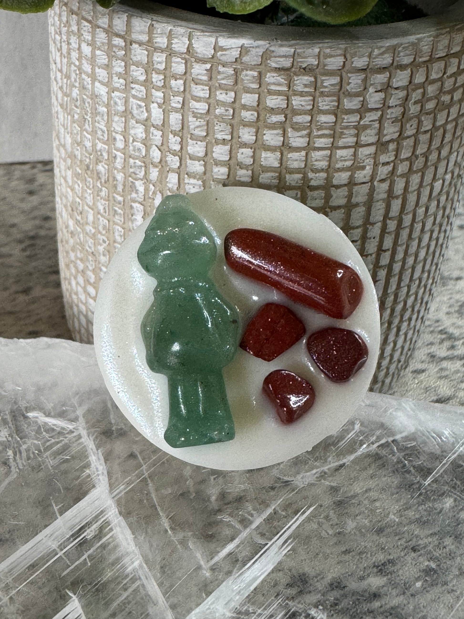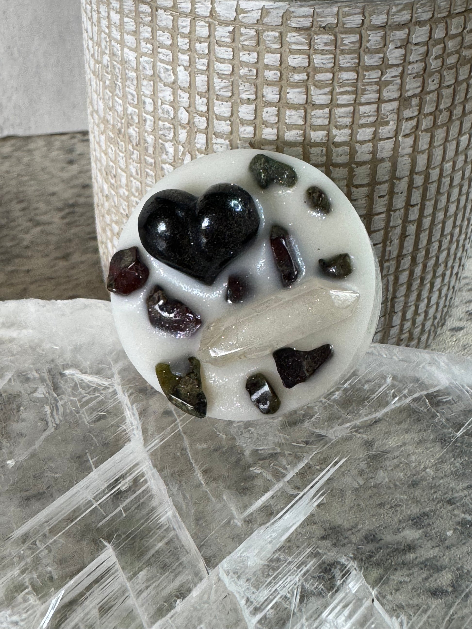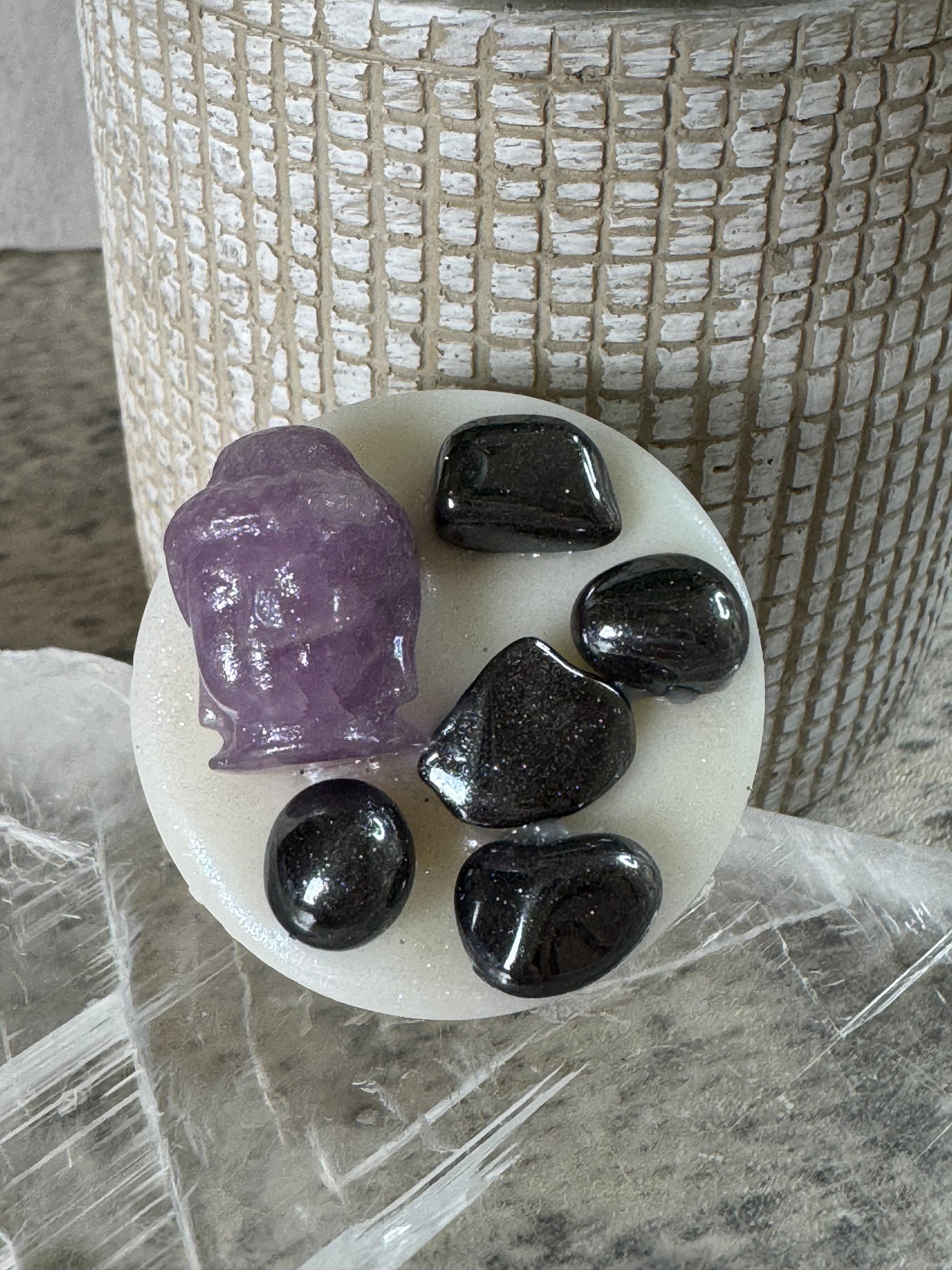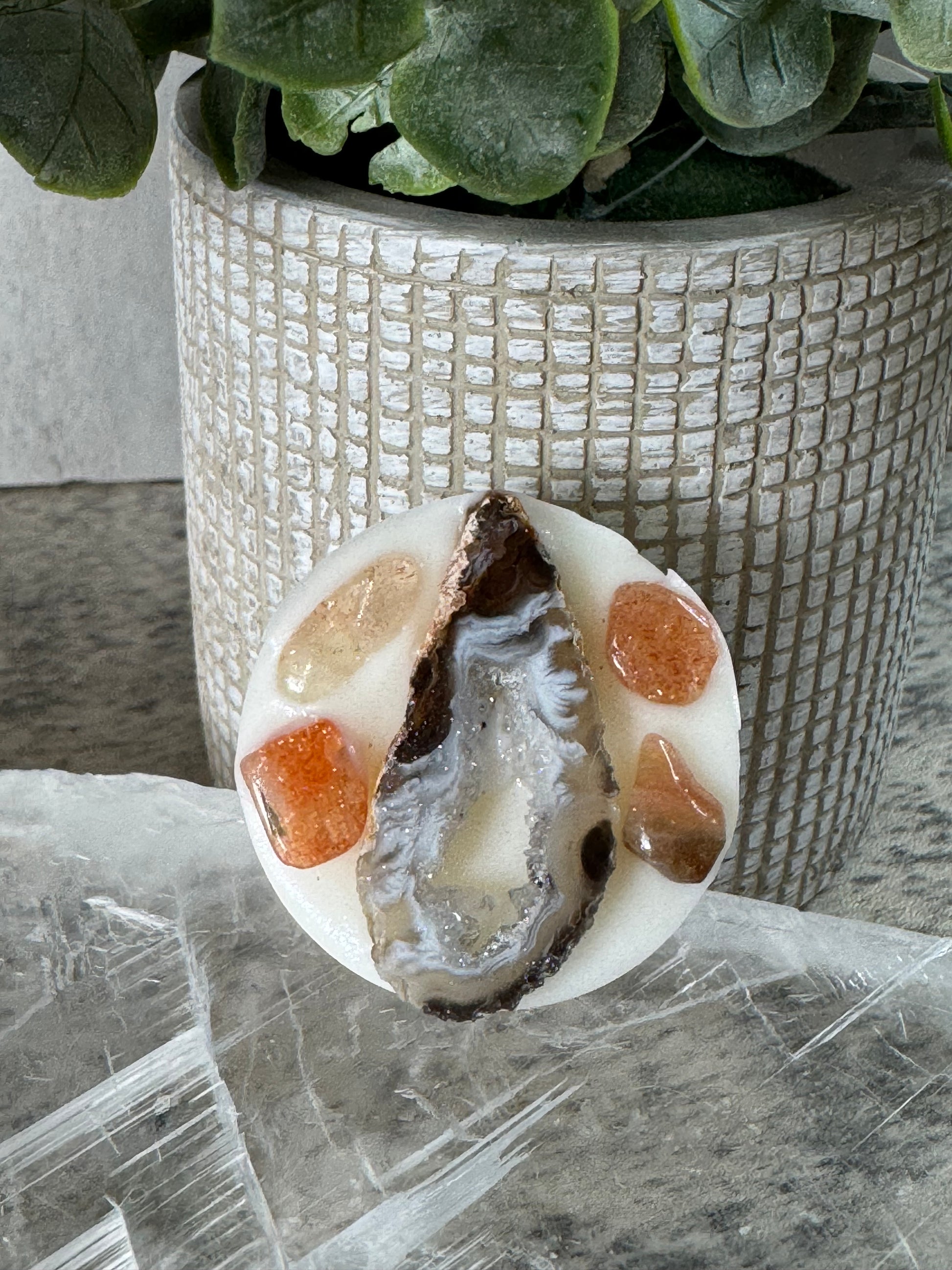 Indulge in a luxurious ambiance with our Crystal Pod wax melts. Handcrafted with a round wax slab, each piece is adorned with elegant crystals, sourced from some of the best crystal shops! Bring a touch of glamour and relaxation to any room with this exquisite addition. Available now for an elevated sensory experience.
